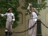 Миледи для сцены собственной казни, вероятно, специально прикупила босоножки...Жутко модные в нач.80-х годов XX столетия.