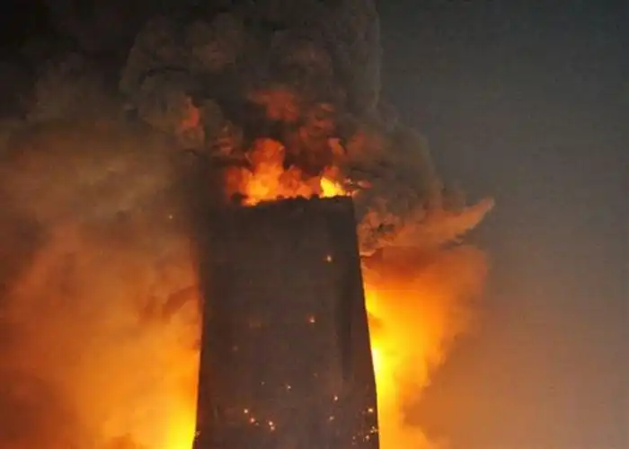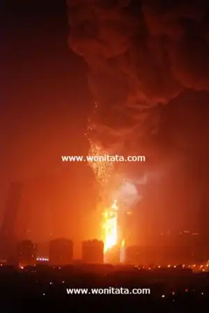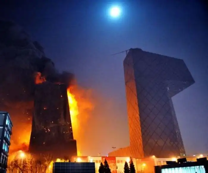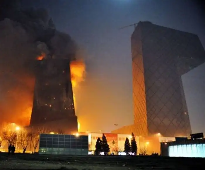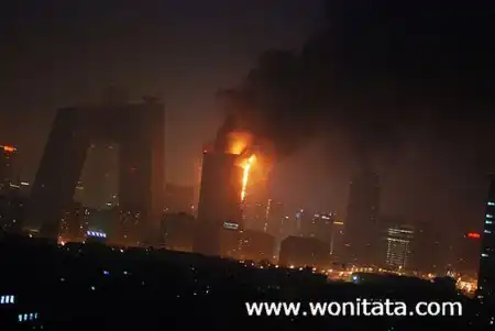 Одно из зданий Центрального телевидения, а именно 160-метровое здание, в котором должен было разместиться люкс-отель "Мандарин", загорелось вечером, во время празднования китайского Нового года. Это событие традиционно отмечается "с огоньком" - по всему городу поджигают фейерверки и взрывают хлопушки. Некоторые очевидцы утверждают, что пожар начался с крыши, куда стали падать фейерверки, затем огонь быстро распространился вниз. Сообщений о жертвах пока не поступало, но есть информация, что в здании в момент возгорания находились люди. Официальное открытие отеля было запланировано на лето.
