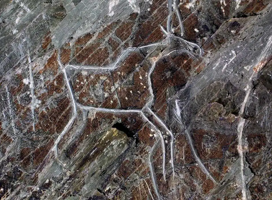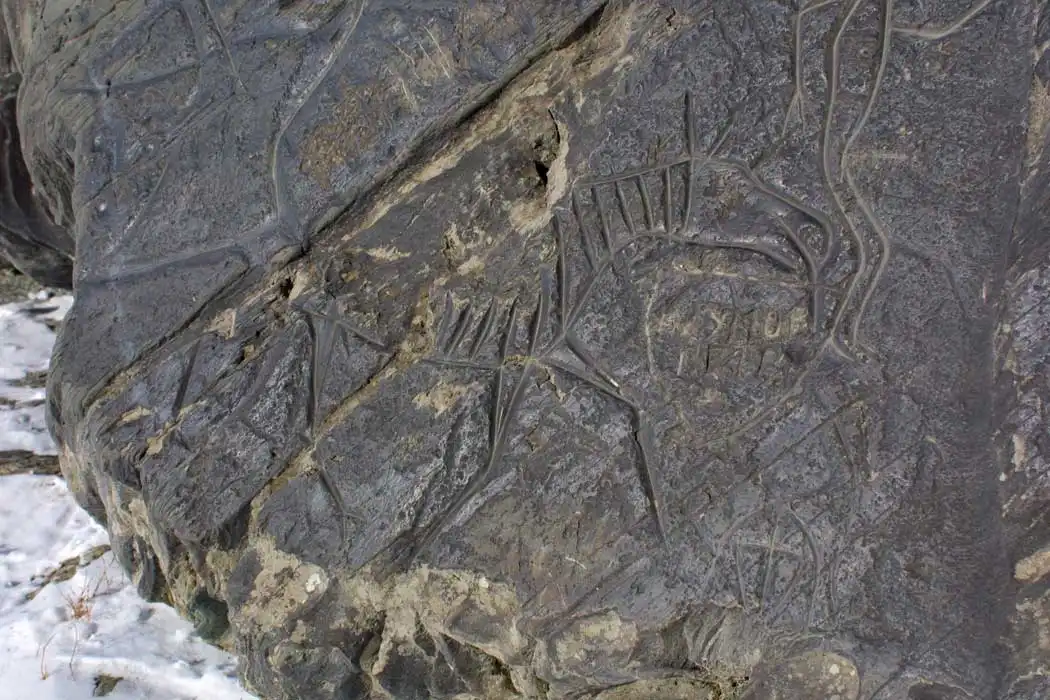 С лосями связаны антропоморфные изображения. Это схематичные рисунки людей часто в звериных масках, которые или охотятся на зверей или участвуют в оплодотворении животных. Среди изображений выбиты знаки солнца.