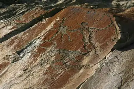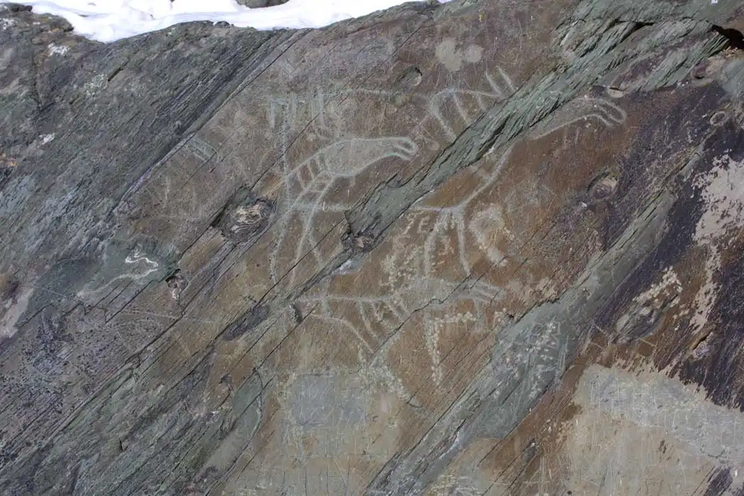 Вторая большая группа изображений относится к эпохе бронзы, к II тыс. до н.э. Среди них уникальный олень-солнце, танцующие птицелюди, таинственные личины. Очевидно, это образы не реальных людей, а духов-предков.