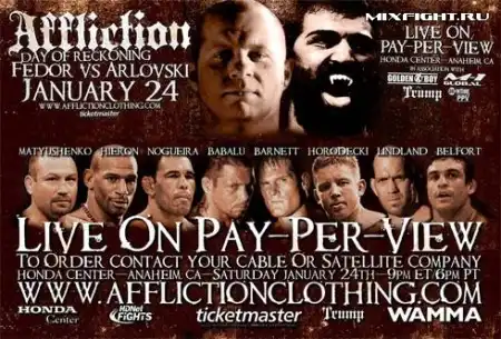 Российско-американский альянс уже успел немного потрепать нервы Дэйне Уайту, как бы он ни старался сохранять абсолютную индифферентность по отношению к данному проекту. Изначально компания по производству одежды и аксессуаров Affliction работала с UFC в связке, и было это ещё совсем недавно. Практически у каждого из лучших бойцов организации были свои именные товары, на церемониях взвешивания и выхода к октагону в глазах рябило от обилия черепов, дьяволов и прочих инфернальных картинок, которые давно стали отличительными знаками товаров Affliction. Однако со временем пути одёжной и боевой организаций стали расходиться, а в прессе появились заявления о том, что Affliction собирается проводить свои альтернативные турниры, причём, судя по называемым именам возможных участников, очень даже недурственного качества. Поначалу идея казалась странной - как бы вы отнеслись, скажем, к альтернативным гонкам Формулы-1, организованным заводом "Красная швея"? - однако вначале появились новости о союзе с российской организацией М-1, а потом в июле 2008 года состоялся первый турнир Affliction & M-1, в котором приняло участие большое количество именитых бойцов, а главным событием стало по сути первое появление Фёдора Емельяненко перед американской публикой.