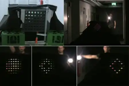 При движении руки с лампой вправо, влево, вверх или вниз камера видела на месте коробки самые разные знаки — растущий и сжимающийся ромб, вспыхивающий квадрат и так далее.