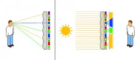 Что удивительно, работают они исключительно за счёт армии хитроумно расположенных крошечных линз и экранчиков. Никакой электроники и никаких датчиков внешнего освещения тут нет.
