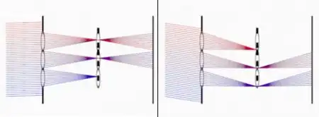 В зависимости от принятой оптической схемы дисплея последняя может находиться в той же плоскости, что и линзы (то есть внутри них), либо в их фокусе.