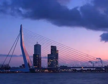 Мост "Эразма" в Роттердаме. За ним давно закрепилось прозвище "Лебедь", полученное из-за формы опоры, поддерживающей мост. В "Эразме" соединились две конструкции: необычный одноопорный висячий мост и самый длинный в мире 82-метровый разводной мост. Этот роттердамский мост стал третьим кабельным по величине в мире. С 1996 года открытый для движения королевой Нидерландов Беатрикс, мост в дальнейшем еще достраивался по причине обнаруженных проблем в конструкции. Строительство "Эразмы", длиной в 900 метров и весом в 6800 тонн, стоило правительству 110 миллионов долларов.