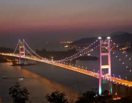 Мост Тсинь Ма в Гонконге. Один из шести самых длинных - 2,2 километра - подвесных мостов в мире, обеспечивающий как магистральное, так и железнодорожное сообщение, является частью инфраструктуры международного аэропорта Гонконга и одним из самых известных местных ориентиров. Строительство Тсинь Ма обошлось в 900 миллионов долларов, после 5 лет работ мост открылся в 1997 году. 49000 тонн стали ушли на строительство платформы, в то время как на каждую башню 205 метров высотой потребовалось 65000 тонн бетона. Мост Тсинь Ма - одна из самых главных достопримечательностей Гонконга, особенно красиво он выглядит при ночной подсветке.