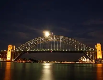 Мост Харбор-бридж в Сиднее. В 2007 году он отпраздновал свое 75-летие. Пролет его единственной арки, которая возвышается над водой на 150 метров, составляет 550 метра. Дорожный настил моста длиной в 1000 метров располагается на высоте 55 метров. В центре он подвешен к арке, а затем продолжается к двум береговым каменным опорам высотой 100 метров каждая. Ширина моста - 49 метров. Полный вес - 52800 тонн. Харбор-бридж также имеет прозвище - "Вешалка" из-за своей арочной формы. Также ему повезло с соседством - на фоне моста можно делать умопомрачительные пейзажи с близлежащими оперными домами. Для появления этого детища на свет пришлось снести около 800 жилых домов