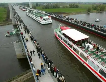 Магдебургский "Водный мост". 918-метровый Магдебургский водный мост в Германии, завершенный в октябре 2003 года, соединяет два важных канала: канал Эльба - Хафел и Средиземный канал, ведущий в индустриальную долину Рура. На его строительство ушло 6 лет, 733 миллиона долларов, 68000 кубических метров бетона и 24000 тонн структурной стали
