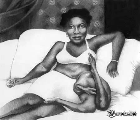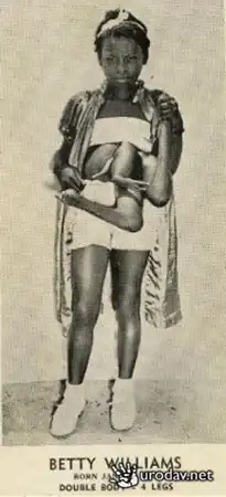 С левой стороны ее живота росла часть сестры-близнеца, которая имела две ноги и одну руку, прикрепленную к массивному торсу.