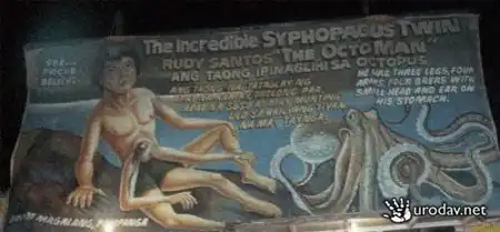 Руди Сантос, прозванный «Человек-осьминог» родился на Филиппинах…Он имел три ноги и четыре руки, хотя одна из его ног была недоразвита ниже колена.