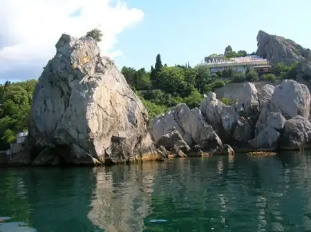 Сам домик запрятан в скалах, если приглядеться - видно только смотровую площадочку. Сверху виден корпус лагеря "Скальный" (Артек). То есть место и в самом деле очень уединенное и обособленное.