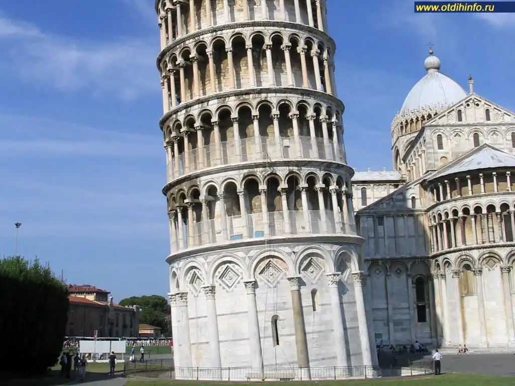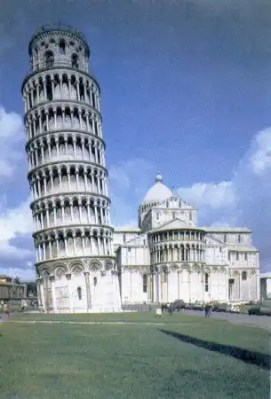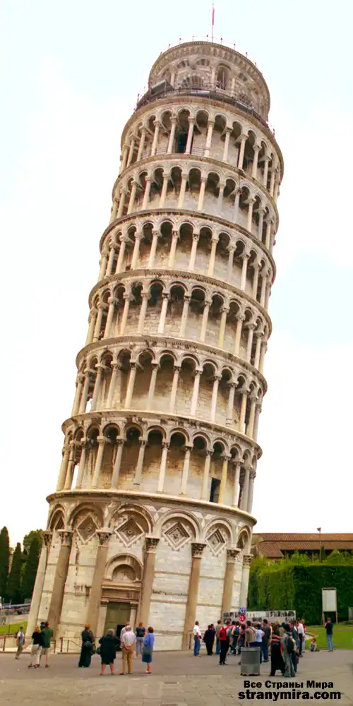 Знаменитая 'падающая' башня (Torre Pe'ldente) - это колокольня (Campanile) собора в городе Пизе, часть редкостного по своей красоте архитектурного ансамбля, состоящего, помимо колокольни и собора, еще из часовни для крещения (баптистерия) и кладбища. Если бы 'падающая' башня не кренилась, а стояла строго вертикально, как все остальные башни на свете, слава ее ограничилась бы, вероятно, лишь узким кругом архитекторов и историков. Благодаря же своему конструктивному изъяну она известна во всем мире.