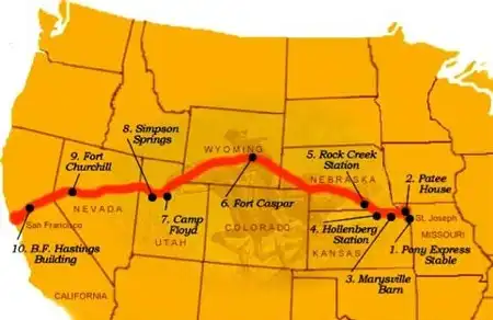 Путь курьера в западном направлении выглядел так: от Сент-Джозефа до Мэрисвилля, штат Канзас, оттуда – на северо-восток до форта Кирни в Небраске, далее – в форт Ларами в Вайоминге, затем через Южный проход до форта Бриджер, а из него – в Солт-Лейк-Сити, территория Юта. Из Солт-Лейк-Сити курьер через Великий бассейн, Юта-Невадскую пустыню и Сьерра-Неваду двигался до Сакраменто. Здесь маршрут «Пони-Экспресса» заканчивался, почта на пароходе отправлялась по реке Сакраменто в Сан-Франциско, но если курьер опаздывал на пароход, то ему приходилось самому отвозить почту в Сан-Франциско. По тому же маршруту курьеры двигались на восток.
