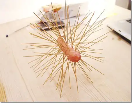 Берем сосиску и пачку спагетти. Протыкаем сосиску 30-40 спагеттинами и аккуратно помещаем в кастрюлю с кипящей водой. Варим до готовности: