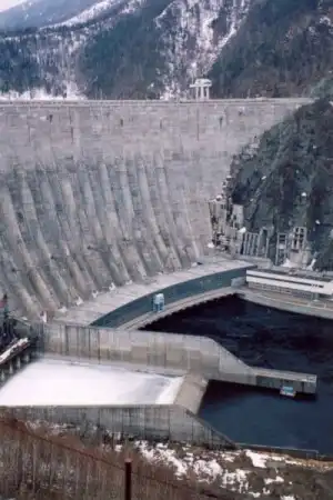 бетонная арочно-гравитационная плотина высотой 245 м, длиной 1066 м, шириной в основании — 110 м, шириной по гребню 25 м. Плотина включает левобережную глухую часть длиной 246,1 м, станционную часть длиной 331,8 м, водосливную часть длиной 189,6 м и правобережную глухую часть длиной 298,5 м.