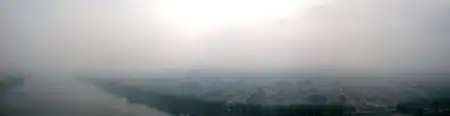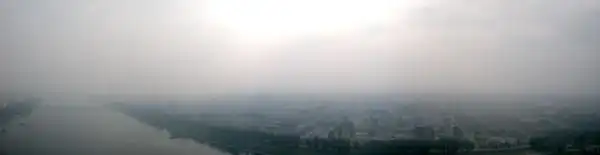 Проснувшись, мы обнаружили примерно такую панораму утреннего Пхеньяна - покрытую дымкой. Как выяснилось, так происходит каждое утро, днем дымка рассеивается. Очевидно, климат там такой