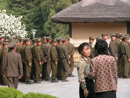 С точки зрения стороннего наблюдателя из-за этого может показаться, что КНДР - жутко милитаризованная страна, куда не посмотришь - военные. Никто же не разбирается что, как правило, это обычные строители :)