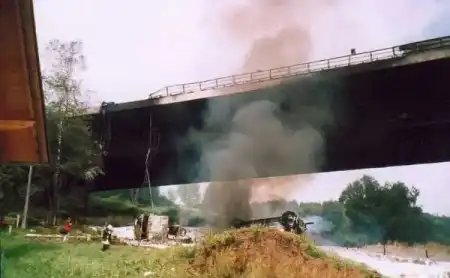 9. 26 августа 2004 года автомобиль врезался в заправленный под завязку бензовоз. 32 тысячи литров топлива взорвались, уничтожив автомобильный мост Wiehltal. Все это происходило в германии. Мост сорвало с креплений и отнесло в сторону. Стоимость ремонта и восстановления моста - $358 миллионов долларов.
