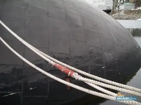 У корабля 2 прочных корпуса расположенных параллельно, и несколько прочных модулей связанных единым наружным корпусом. Он несет 20 твердотопливных БР, расположенных между прочными корпусами. В прочных модулях за пределами ПК находиться торпедное вооружение на носу лодки и также ЦП и аппаратура РЭВ. Благодаря такой компоновке у этого корабля получено самое большое из всех отечественных и импортных АПЛ подводное и надводное водоизмещение и ширина корпуса.