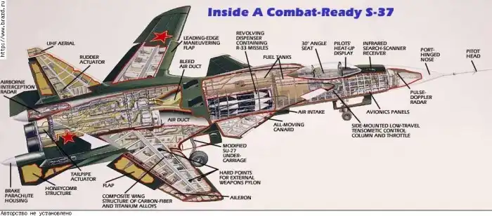 Hаличие на самолете отсека вооружения, показанного на компоновке самолета, они не отрицают и не подтверждают. Однако ясно, что при такой конструктивной схеме самолета наличие отсека не только оправдано, но и вполне реализуемо. Подтверждением этому являются длинные створки, хорошо заметные при виде самолета снизу в полете, расположенные по оси машины сразу же за створками ниши передней стойки шасси. Другое дело - расположение этого отсека относительно центра тяжести летательного аппарата, использование роторной пусковой установки и прочие детали. Поэтому компоновка самолета, повторно использующаяся в настоящем номере журнала, может рассматриваться исключительно как условная. Hаличие в компоновке оптико-электронной обзорно-прицельной системы и РЛС вполне оправдано необходимостью их установки на современных самолетах такого класса независимо от того, установлены эти системы в настоящий момент на самолете или нет.