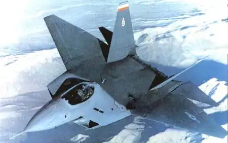 Другой претендент, YF-23, обладал более футуристической внешностью. Его основные особенности - ромбовидное крыло, имевшее одинаковый угол стреловидности (40 град.) по передней и задней кромкам; вместо раздельного вертикального и горизонтального оперений самолет получил две цельноповоротные плоскости, установленные под углом 50 град. к вертикали (такое решение обеспечило существенное снижение радиолокационной заметности). По сравнению с "рубленым" YF/A-22 машина фирмы "Нортроп" обладала плавными, как у бомбардировщика "Нортроп" В-2, обводами планера. Сопла двигателей были неповоротными, с "горбами", выводившими выхлопные газы на верхнюю поверхность планера, что значительно уменьшало тепловую заметность, а также экранировало ТРДЦФ при радиолокационном визировании сзади.