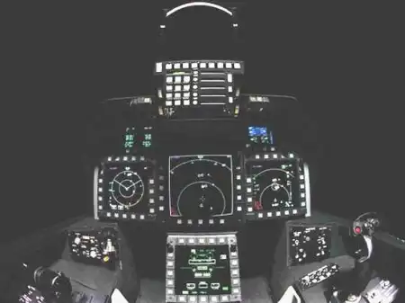 В центре приборной доски расположен основной многофункциональный жидкокристаллический цветной дисплей с размером экрана 203х203 мм, на который выводится синтезированная информация о тактической обстановке. По бокам его, а также снизу расположены три многофункциональных цветных индикатора на жидких кристаллах с размерами экранов 155х155 мм (в типовой конфигурации на левый дисплей выводится детализированная информация о самолетах противника и его средствах ПВО, на правом - решается тактическая задача атаки, на нижний выдаются сведения о состоянии бортового вооружения). В верхней части приборной доски находятся два жидкокристаллических индикатора (75х102 мм), на которые выводятся навигационная и связная информация. Обычные электромеханические приборы в кабине отсутствуют.