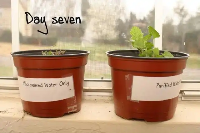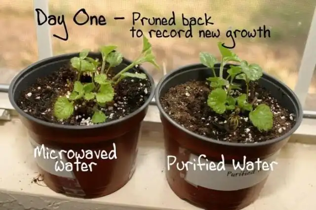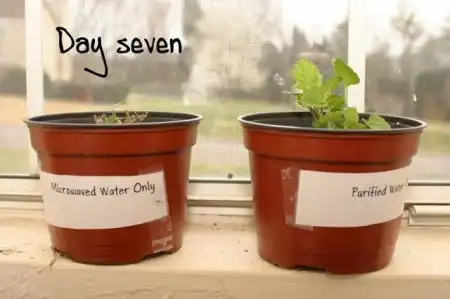 Одно растение поливали обычной кипяченной водой, второе кипяченной в микроволновке.