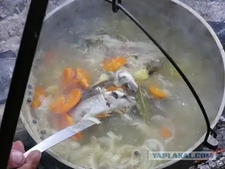 Приготовление ухи завершается вливанием в котелок рюмки водки и опусканием в него тлеющей головёшки.
