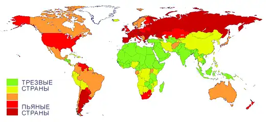 Самые трезвые страны закрашены на карте зелёным цветом; те, в которых существуют проблемы с некоторыми наркотиками (например, в Китае ещё не решена проблема курения) — жёлтым, и т.д. Нам с вами пришлось жить в самом аду этого наркотизированного мира — Украина, как и Россия, и почти вся Европа, окрашена тревожной, тёмно-красной краской наркотических страданий.