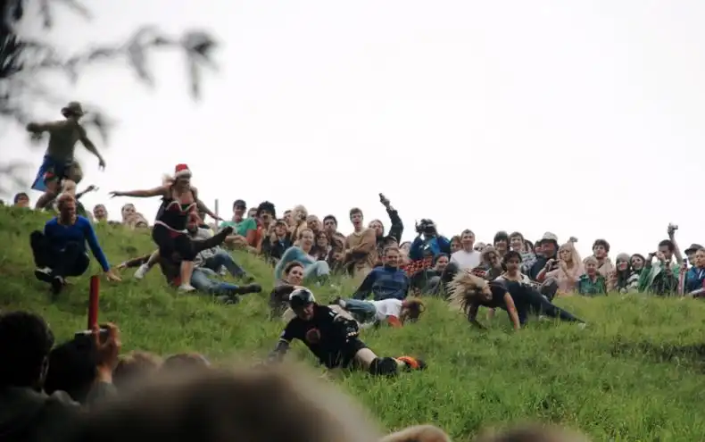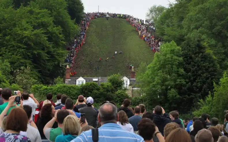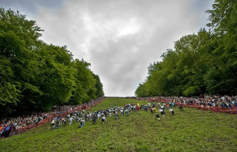 В Англии смельчаки каждый год собираются на горе и катятся вниз за 3,5-килограммовой головкой сыра.