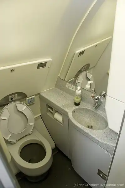 В баке это все дело хранится и накапливается весь полет. В работе туалета на А-320 и Ту-154М есть некоторые различия. В А-320 удаление отбросов из унитаза происходит с помощью вакуума. Вообщем, дерьмо, попросту засасывает в бак. Не знаю насколько реально присосаться к унитазу, но лучше не экспериментировать, т.к. теоретически это возможно. На Ту-154 в баке с отходами стоит фильтр, который задерживает крупные частицы (буээээ), а отфильтрованное отправляется насосом снова наверх, чтобы смывать унитаз. Вообщем, после длительного полета концентрация нехороших вещей в воде будет только увеличиваться. Для того, чтобы эта жижа сильно не воняла, в бак добавляют химию (бросают маленькие мешочки прям в горшок, которые потом растворяются и обеззараживают воду). Принцип действия и запах этой химии такой же, как в обычном биотуалете. Гоняется говно по кругу беспощадно. В Boeing-737 Classic система точно такая же. Жидкость в такой туалет необходимо заправить заранее, что и делается перед каждым вылетом.