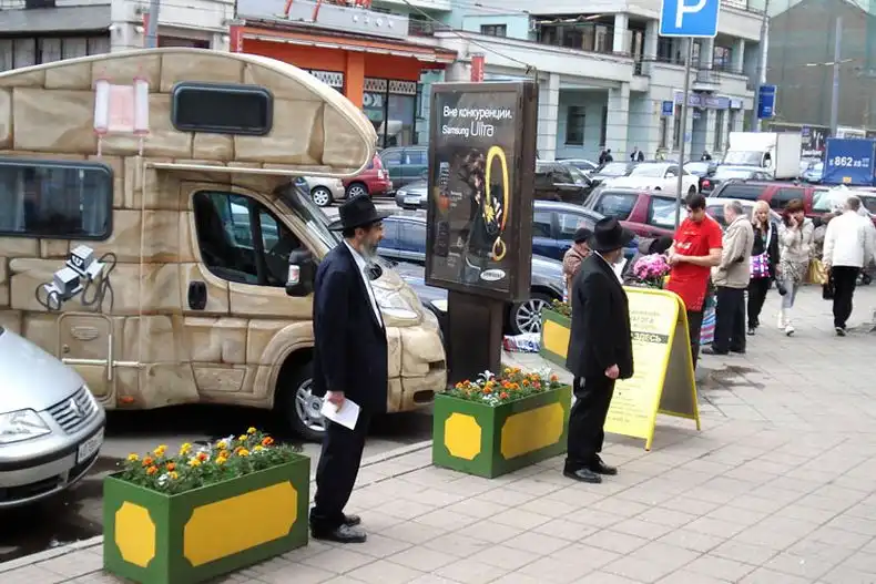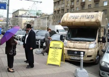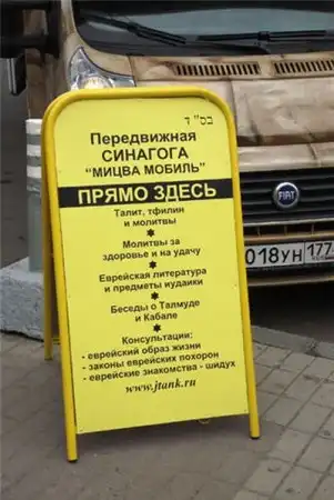 Прогуляйтесь по центру Москвы - и вы обязательно встретите этот "Мицва мобиль" с двумя раввинами на борту. Раввины расспрашивают прохожих на предмет их веры и, если они являются иудеями, то приглашают их в машину помолиться и просто побеседовать.
