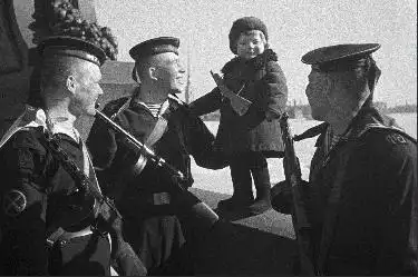 Моряки Балтийского флота с маленькой девочкой Люсей, родители которой умерли в блокаду. Фото Б.Кудояров. 1943 год.