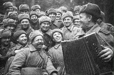 Перед штурмом города Великие Луки. Советские солдаты слушают игру на баяне своего товарища. 1943 год. Фото Максимова.