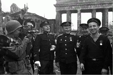 Советские моряки, герои штурма Берлина, позируют американскому военному корреспонденту. Фото С.Шиманского 1945 год.