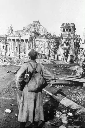 Берлин, 1945 год. Михаил Макаров, боец-пехотинец, который дошел до Берлина. Перед рейхстагом. Фото А.Морозова.
