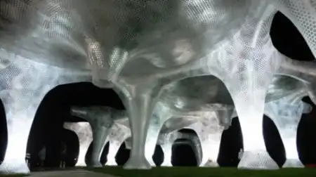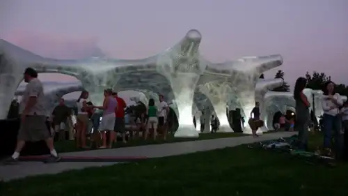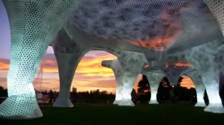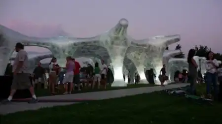 Mass Studies создали этот чудесный павильон для Dialog:City в Денвере прошлым летом. Известный под названием Air Forest (Воздушный Лес), пневматический павильон улавливает проходящие мимо ветровые течения, оставаясь надутым, и обеспечивает тень, в то же время, пропуская солнечный свет и создавая потрясающее общественное помещение. Конструкция площадью 1,400 квадратных метров легко транспортируется, устанавливается в два счёта, не требуя никаких строительных материалов, а ночью она светится. Проект Air Forest от Mass Studies – это игривая форма взаимодействия с окружающей средой. Нейлоновая конструкция состоит из 9 шестиугольных навесов, и фиксируется при помощи якорей и осветительного оборудования в каждой из 35 колонн, при ветре и меняющейся погоде она волнообразно колеблется. Отражающие серебристые элементы, покрывающие конструкцию, имитируют окружающий пейзаж и придают ей забавную визуальную структуру.