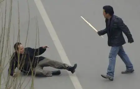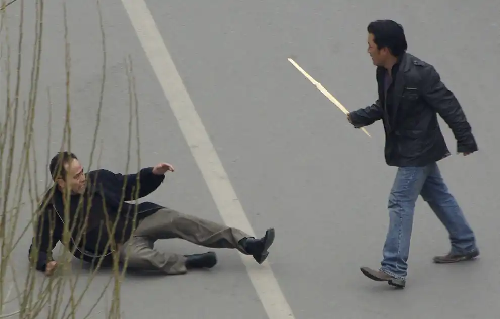 A Tibetan (R) carrying a stick prepares to attack a fallen man in this photograph taken during protests in Lhasa March 14, 2008. Tibetans attacked Han Chinese and their businesses during violent protests in Lhasa over several days. (REUTERS)