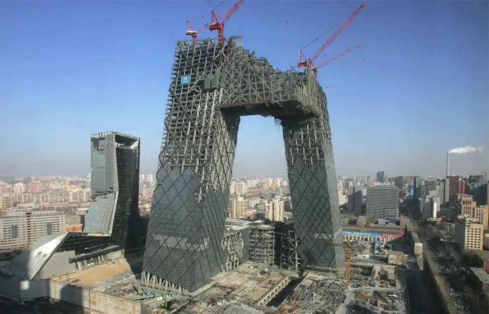 In this Jan. 23, 2008, the construction site of the new China Central Television headquarters building is seen in Beijing. The building's two angled towers were connected in December to form a continuous loop of horizontal and vertical sections. The 230 meter (755 foot) building, one of Beijing's tallest, houses more than 10,000 staff. (AP Photo/Greg Baker)