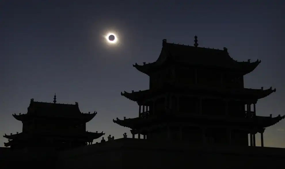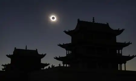 A solar eclipse can be seen above the Jiayuguan Fort on the Great Wall of China in the town of Jiayuguan, Gansu Province, China on August 1, 2008. (REUTERS/David Gray)