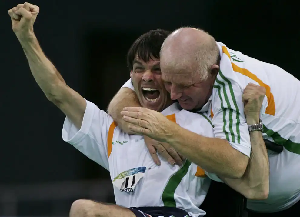 Ireland's Gabriel Shelly, left, along with his coach celebrates after winning the bronze medal in Boccia-1 match against China's Wang Yi at the Paralympic games in Beijing, Tuesday, Sept. 9, 2008. (AP Photo/ Elizabeth Dalziel)