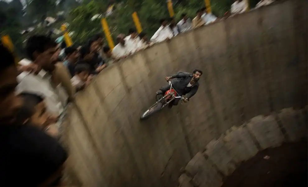 Pakistani people watch as an acrobat rides his motorcycle around a circular track during the memorial of Muslim saint Syed Lal Shah next to his shrine in Muree, about 60 kilometers north of Islamabad, Pakistan on June 15, 2008. Hundred of pilgrims gather during six days every year to pay respect at the tomb of Syed Lal Shah. (AP Photo/Emilio Morenatti)
