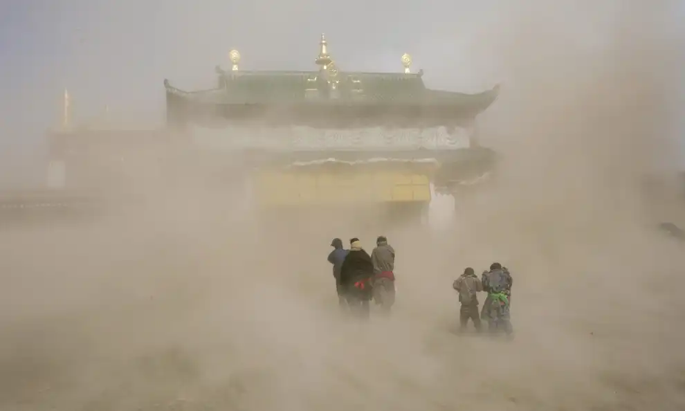 Ethnic Tibetan worshippers enter a monastery to celebrate Monlam, or Great Prayer Festival, during a sandstorm in Aba, Sichuan province, February 17, 2008. Thousands of Tibetan pilgrims gathered to celebrate Monlam, one of the most important festivals in Tibetan Buddhism. (REUTERS/Reinhard Krause)
