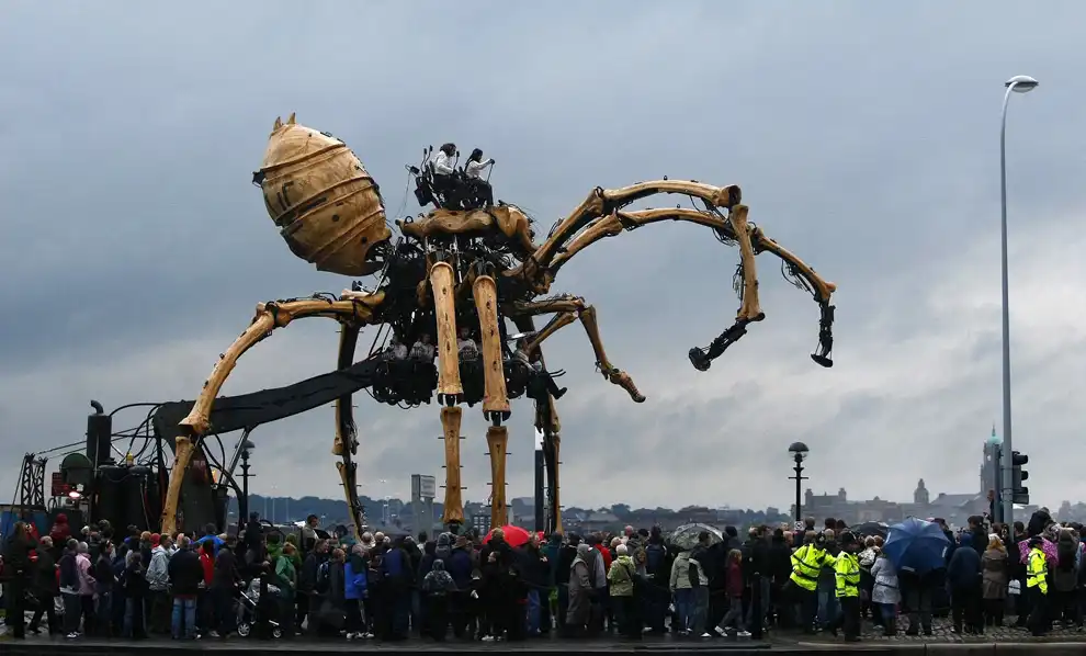 A giant mechanical spider, part of a piece of free theater by French company La Machine entitled "Les Mecaniques Servants", walks along the waterfront in Liverpool, England on September 5, 2008. The 37-ton spider which stands at 50 feet (15 meters) tall was in Liverpool as part of the city's European capital of culture celebrations. (REUTERS/Phil Noble)