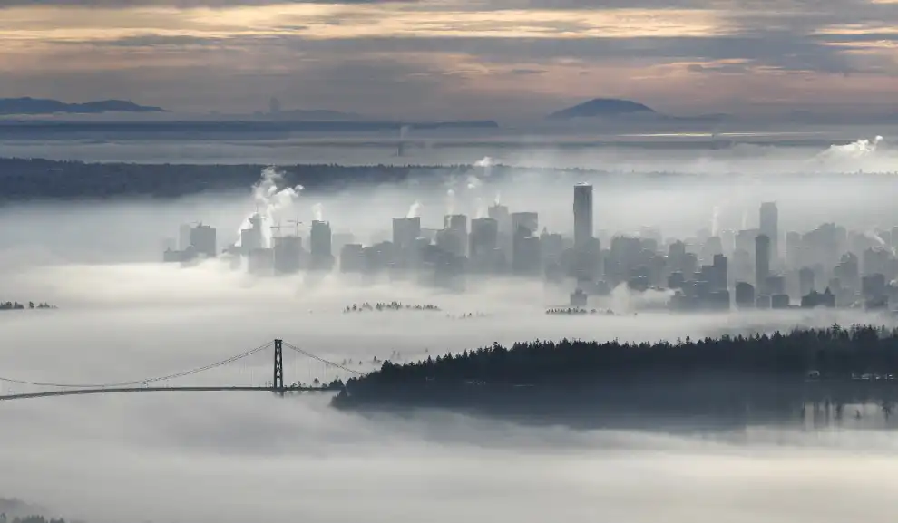 The downtown core of Vancouver and the Lions Gate Bridge rise above a morning fog in this view from Cypress Mountain in West Vancouver, British Columbia November 17, 2008. (REUTERS/Andy Clark)
