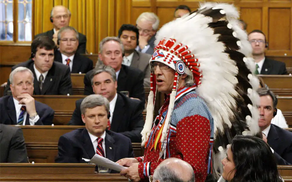 Canada's Prime Minister Stephen Harper (bottom L) and other MP's listen as National Chief of the Assembly of First Nations Phil Fontaine speaks in the House of Commons on Parliament Hill in Ottawa June 11, 2008. Canada, seeking to close one of the darkest chapters in its history, formally apologized earlier that week for forcing 150,000 aboriginal children into grim residential schools, where many say they were abused. (REUTERS/Chris Wattie)