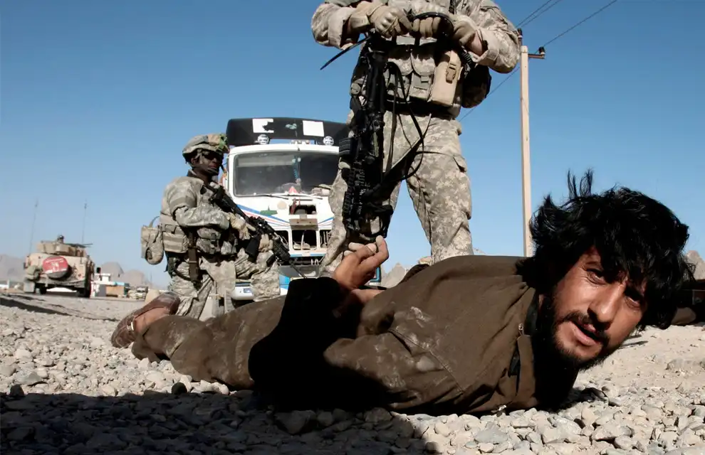 U.S. soldiers search for weapons on an Afghan man, who works for a private security firm escorting truck convoys, after they found illegal weapons in his vehicle, in a village near Kandahar, Afghanistan in this April 27, 2008 photo. Forty countries are now contributing to the NATO-led International Security Assistance Force (ISAF) which has around 47,000 troops. the United States also contributing some 14,000 troops serving in a separate force. (REUTERS/Goran Tomasevic)