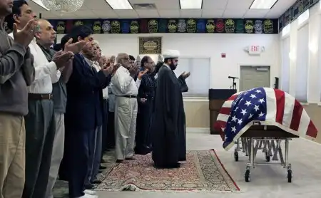 Imam Hashim Raza leads mourners in prayer during a funeral for Mohsin Naqvi at al-Fatima Islamic Center in Colonie, N.Y., Monday, Sept. 22, 2008. Naqvi was a Muslim, a native of Pakistan (he emigrated to the U.S. with his family when he was 8 years old and became a citizen at 16) and a U.S. Army officer. He was killed by a roadside bomb while on patrol in Afghanistan. (AP Photo/Mike Groll)