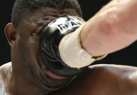 Samuel Peter from Nigeria receives a punch from Vitali Klitschko of Ukraine during their WBC heavyweight boxing world championship fight in Berlin, Germany on Oct. 11, 2008. Klitschko won the fight after round nine due to technical knock out. (AP Photo/Herbert Knosowski)