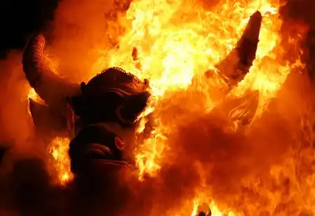 A bull sarcophagus in which a member of the Ubud royal family was cremated burns during the funeral ceremony Tuesday July 15, 2008 in Ubud, Bali, Indonesia. (AP Photo/Ed Wray)